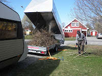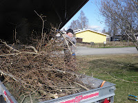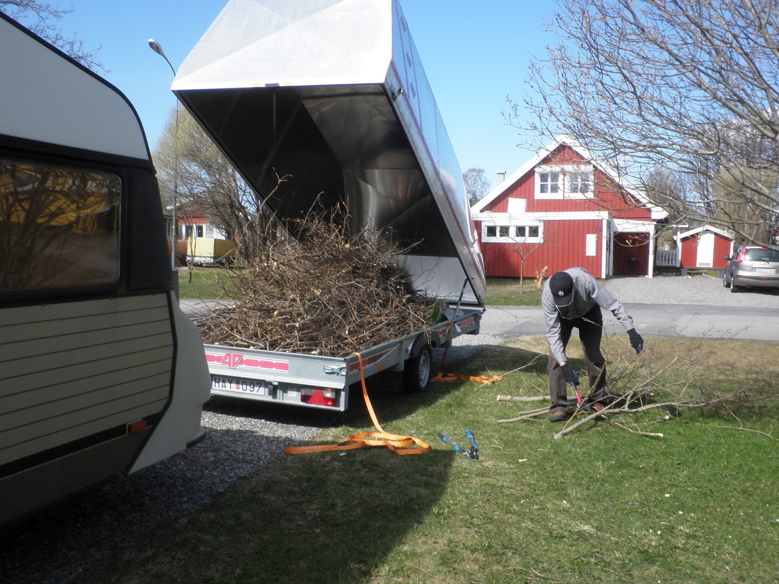 Jag började dagen, förutom frukost, med att försöka kvista, för att reducera spretigheten i syrenbusken som jag lastade i släpet. Tog även med glas- och metallförpackningar smt elektronikskrot och restavfall. En syren som stått några år är minsann spretig. Jag åkte iväg med lasset ooch till min förvåning var det inte fullt uppe på rampen, så det gick snabbt att bli av med det som skulle dit. Sedan åkte jag till rishögen. Det gick väl ganska bra att lossa, men nog spretade det. Jag kopplade loss släpet hemma, för vi skulle till Fagerudden, där Gun-Britt skulle söka bland sina pärmar efter en faktura från 2004, som försäkringsbolaget vill ha. Vi var förbi ICA-Bergsviken för att komplettera ingredienser till "Dans limpa", för nu skulle det bakas limpa. Medan jag städae ur släpet, gjorde G-B sju limpor. Vi tog två med oss och åkte tillbaka med vagnen till Bo. Där var han och barnen ute på gården. De höll på med krattning, men när vi kom lyttades focus till kurragömmalek i stället. Det var roligt att få leka med barnen en stund, de tycktes uppskatta det. Men klockan gick, som den gör när man har roligt, så vi vände hemåt. Som synes har vi haft en vacker dag. Grönskan har kommit igång, men sommarvärme är det inte.